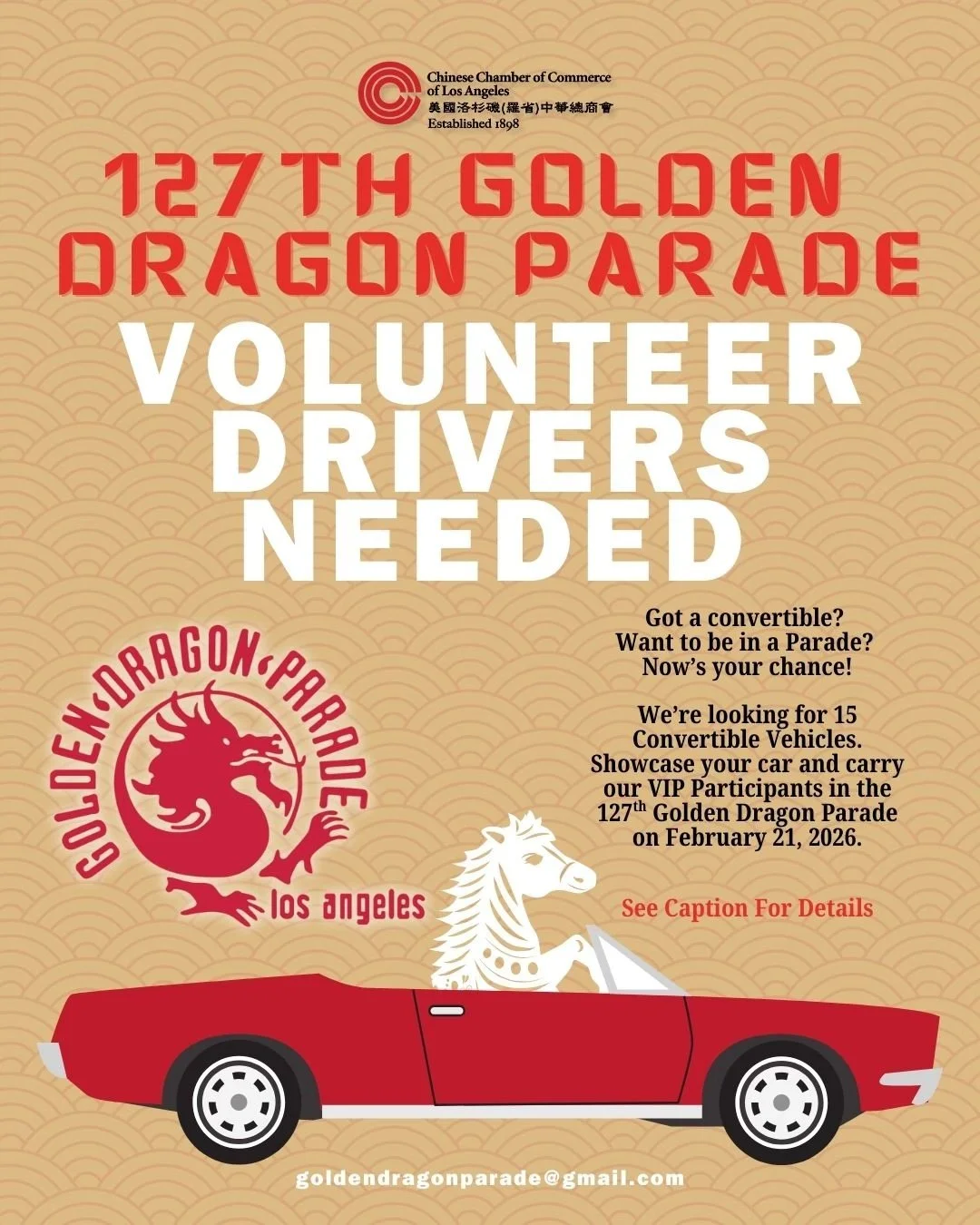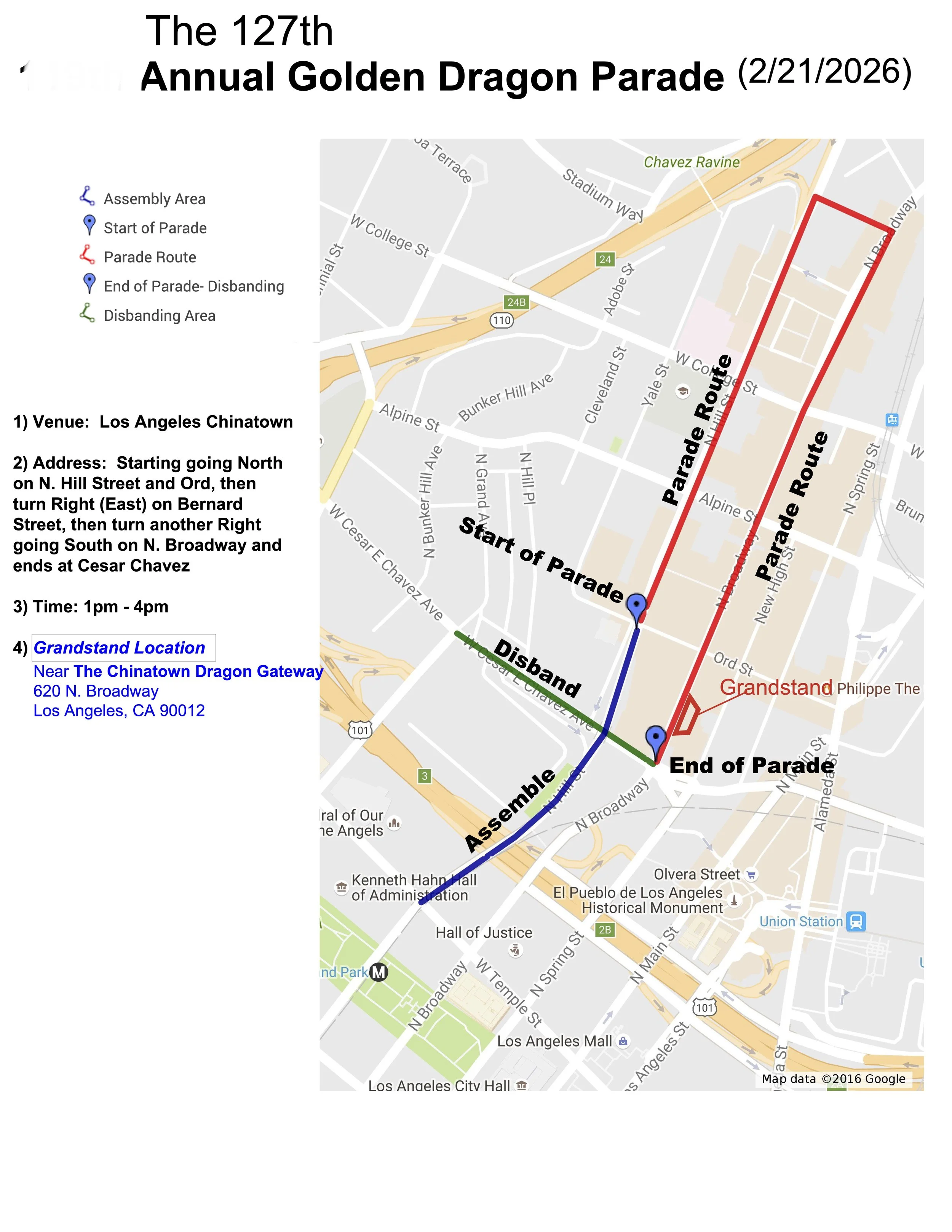 Each year, the Chinese Chamber of Commerce of Los Angeles hosts the Annual Golden Dragon Parade. With over a hundred thousand spectators and thousands more viewing the telecast on main stream TV such as ABC7, NBC4, Telemundo 52, and many online broadcast channels, this colorful celebration along North Broadway in Chinatown has become the premiere cultural event in the Southern California Asian-American Community.